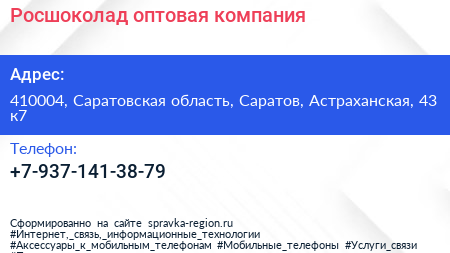 Росшоколад, оптовая компания по адресу 410004, Саратовская область, Саратов, Астраханская, 43 к7 в дальнейшем Организация, размещена в следующих категориях: