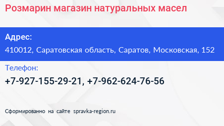 Розмарин, магазин натуральных масел по адресу 410012, Саратовская область, Саратов, Московская, 152 в дальнейшем Организация, размещена в следующих категориях: