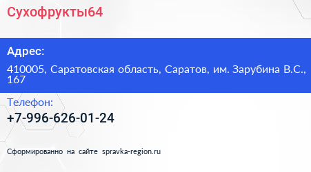 Сухофрукты64 по адресу 410005, Саратовская область, Саратов, им. Зарубина В.С., 167 в дальнейшем Организация, размещена в следующих категориях: