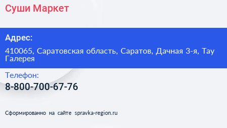 Суши-Маркет по адресу 410065, Саратовская область, Саратов, Дачная 3-я, Тау Галерея в дальнейшем Организация, размещена в следующих категориях: