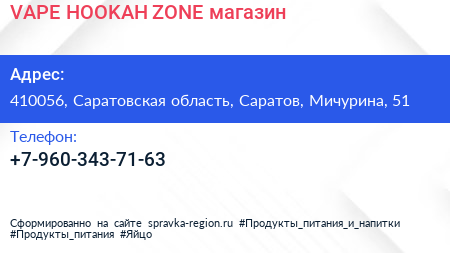 VAPE & HOOKAH ZONE, магазин по адресу 410056, Саратовская область, Саратов, Мичурина, 51 в дальнейшем Организация, размещена в следующих категориях: