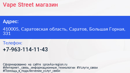 Vape Street, магазин по адресу 410005, Саратовская область, Саратов, Большая Горная, 331 в дальнейшем Организация, размещена в следующих категориях: