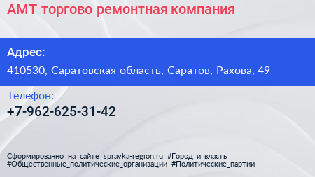 АМТ, торгово-ремонтная компания по адресу 410530, Саратовская область, Саратов, Рахова, 49 в дальнейшем Организация, размещена в следующих категориях: