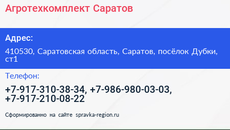 Агротехкомплект-Саратов по адресу 410530, Саратовская область, Саратов, посёлок Дубки, ст1 в дальнейшем Организация, размещена в следующих категориях: