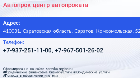 Автопрок, центр автопроката по адресу 410031, Саратовская область, Саратов, Комсомольская, 52 в дальнейшем Организация, размещена в следующих категориях: