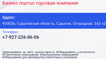 Бизнес-портал, торговая компания по адресу 410036, Саратовская область, Саратов, Огородная, 162 к1 в дальнейшем Организация, размещена в следующих категориях: