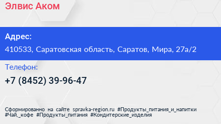 Элвис Аком по адресу 410533, Саратовская область, Саратов, Мира, 27а/2 в дальнейшем Организация, размещена в следующих категориях: