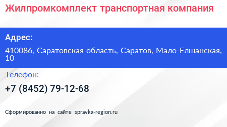 Жилпромкомплект, транспортная компания по адресу 410086, Саратовская область, Саратов, Мало-Елшанская, 10 в дальнейшем Организация, размещена в следующих категориях: