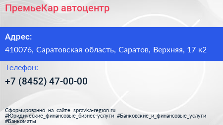 ПремьеКар, автоцентр по адресу 410076, Саратовская область, Саратов, Верхняя, 17 к2 в дальнейшем Организация, размещена в следующих категориях: