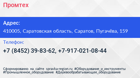 Промтех по адресу 410005, Саратовская область, Саратов, Пугачёва, 159 в дальнейшем Организация, размещена в следующих категориях: