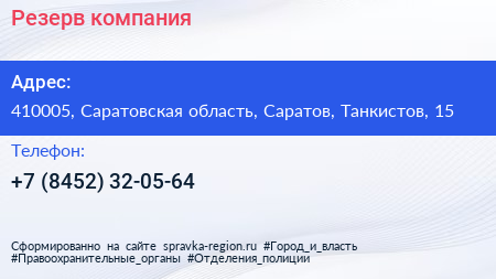 Резерв, компания по адресу 410005, Саратовская область, Саратов, Танкистов, 15 в дальнейшем Организация, размещена в следующих категориях: