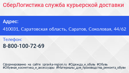 СберЛогистика, служба курьерской доставки по адресу 410031, Саратовская область, Саратов, Соколовая, 44/62 в дальнейшем Организация, размещена в следующих категориях: