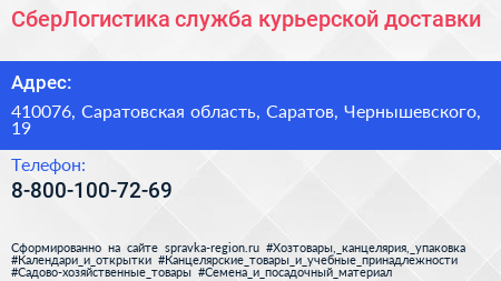 СберЛогистика, служба курьерской доставки по адресу 410076, Саратовская область, Саратов, Чернышевского, 19 в дальнейшем Организация, размещена в следующих категориях: