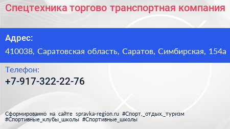 Спецтехника, торгово-транспортная компания по адресу 410038, Саратовская область, Саратов, Симбирская, 154а в дальнейшем Организация, размещена в следующих категориях: