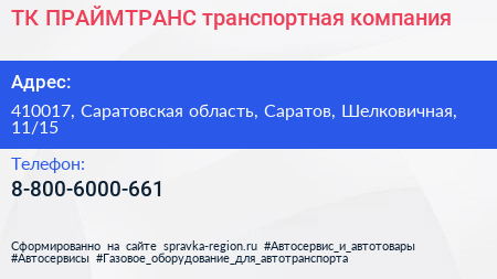 ТК ПРАЙМТРАНС, транспортная компания по адресу 410017, Саратовская область, Саратов, Шелковичная, 11/15 в дальнейшем Организация, размещена в следующих категориях: