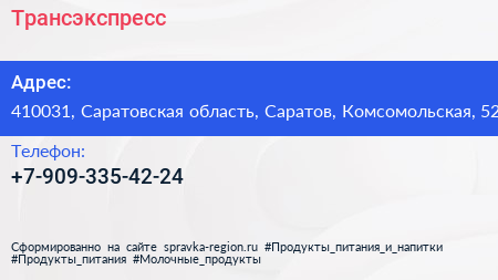 Трансэкспресс по адресу 410031, Саратовская область, Саратов, Комсомольская, 52 в дальнейшем Организация, размещена в следующих категориях: