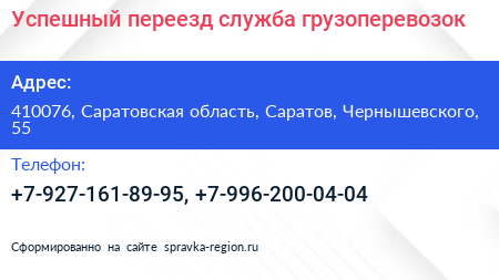 Успешный переезд, служба грузоперевозок по адресу 410076, Саратовская область, Саратов, Чернышевского, 55 в дальнейшем Организация, размещена в следующих категориях: