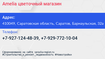 Amelia, цветочный магазин по адресу 410049, Саратовская область, Саратов, Барнаульская, 32а в дальнейшем Организация, размещена в следующих категориях: