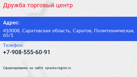 Дружба, торговый центр по адресу 410008, Саратовская область, Саратов, Политехническая, 65/1 в дальнейшем Организация, размещена в следующих категориях: