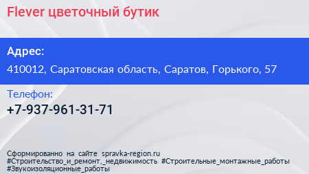 Flever, цветочный бутик по адресу 410012, Саратовская область, Саратов, Горького, 57 в дальнейшем Организация, размещена в следующих категориях: