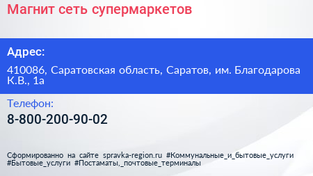 Магнит, сеть супермаркетов по адресу 410086, Саратовская область, Саратов, им. Благодарова К.В., 1а в дальнейшем Организация, размещена в следующих категориях: