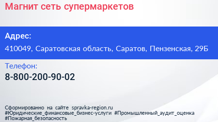 Магнит, сеть супермаркетов по адресу 410049, Саратовская область, Саратов, Пензенская, 29Б в дальнейшем Организация, размещена в следующих категориях: