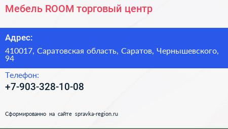 Мебель ROOM, торговый центр по адресу 410017, Саратовская область, Саратов, Чернышевского, 94 в дальнейшем Организация, размещена в следующих категориях: