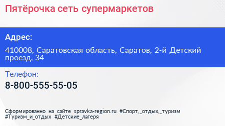 Пятёрочка, сеть супермаркетов по адресу 410008, Саратовская область, Саратов, 2-й Детский проезд, 34 в дальнейшем Организация, размещена в следующих категориях: