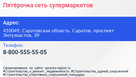 Пятёрочка, сеть супермаркетов по адресу 410049, Саратовская область, Саратов, проспект Энтузиастов, 39 в дальнейшем Организация, размещена в следующих категориях: