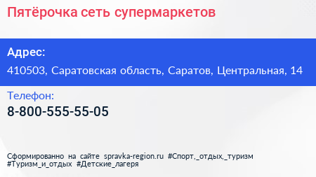 Пятёрочка, сеть супермаркетов по адресу 410503, Саратовская область, Саратов, Центральная, 14 в дальнейшем Организация, размещена в следующих категориях:
