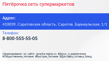 Пятёрочка, сеть супермаркетов по адресу 410039, Саратовская область, Саратов, Барнаульская, 1/1 в дальнейшем Организация, размещена в следующих категориях:
