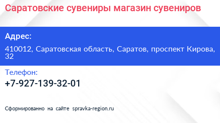 Саратовские сувениры, магазин сувениров по адресу 410012, Саратовская область, Саратов, проспект Кирова, 32 в дальнейшем Организация, размещена в следующих категориях: