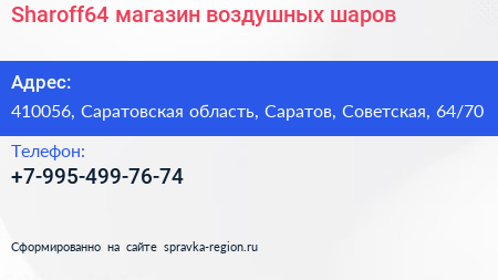 Sharoff64, магазин воздушных шаров по адресу 410056, Саратовская область, Саратов, Советская, 64/70 в дальнейшем Организация, размещена в следующих категориях: