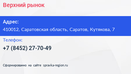 Верхний, рынок по адресу 410012, Саратовская область, Саратов, Кутякова, 7 в дальнейшем Организация, размещена в следующих категориях:
