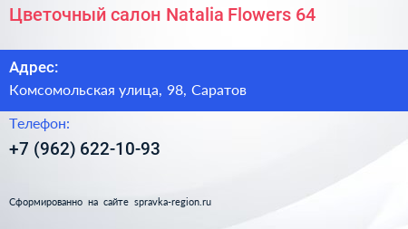 Цветочный салон «Natalia Flowers 64» по адресу Комсомольская улица, 98, Саратов в дальнейшем Организация, размещена в следующих категориях: