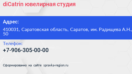 diCatrin, ювелирная студия по адресу 410031, Саратовская область, Саратов, им. Радищева А.Н., 50 в дальнейшем Организация, размещена в следующих категориях: