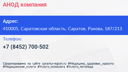 АНОД, компания по адресу 410005, Саратовская область, Саратов, Рахова, 187/213 в дальнейшем Организация, размещена в следующих категориях: