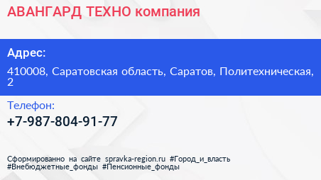 АВАНГАРД-ТЕХНО, компания по адресу 410008, Саратовская область, Саратов, Политехническая, 2 в дальнейшем Организация, размещена в следующих категориях: