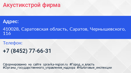 Акустикстрой, фирма по адресу 410028, Саратовская область, Саратов, Чернышевского, 116 в дальнейшем Организация, размещена в следующих категориях: