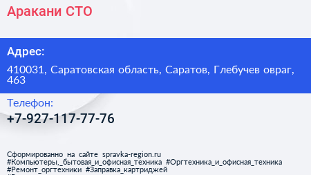 Аракани, СТО по адресу 410031, Саратовская область, Саратов, Глебучев овраг, 463 в дальнейшем Организация, размещена в следующих категориях: