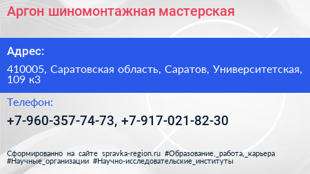 Аргон, шиномонтажная мастерская по адресу 410005, Саратовская область, Саратов, Университетская, 109 к3 в дальнейшем Организация, размещена в следующих категориях: