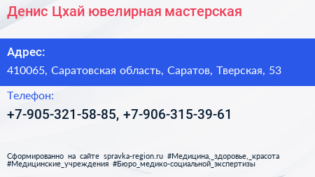 Денис Цхай, ювелирная мастерская по адресу 410065, Саратовская область, Саратов, Тверская, 53 в дальнейшем Организация, размещена в следующих категориях:
