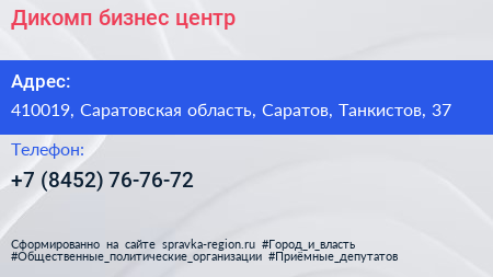 Дикомп, бизнес-центр по адресу 410019, Саратовская область, Саратов, Танкистов, 37 в дальнейшем Организация, размещена в следующих категориях: