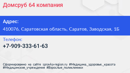 Домсруб-64, компания по адресу 410076, Саратовская область, Саратов, Заводская, 1Б в дальнейшем Организация, размещена в следующих категориях: