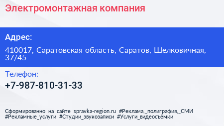 Электромонтажная компания по адресу 410017, Саратовская область, Саратов, Шелковичная, 37/45 в дальнейшем Организация, размещена в следующих категориях: