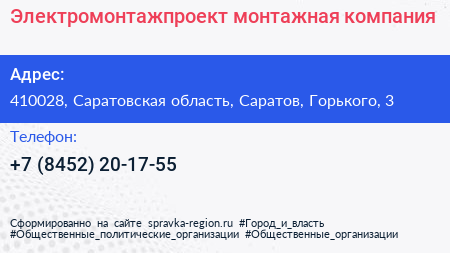 Электромонтажпроект, монтажная компания по адресу 410028, Саратовская область, Саратов, Горького, 3 в дальнейшем Организация, размещена в следующих категориях: