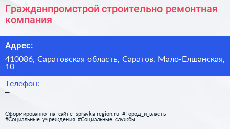 Гражданпромстрой, строительно-ремонтная компания по адресу 410086, Саратовская область, Саратов, Мало-Елшанская, 10 в дальнейшем Организация, размещена в следующих категориях: