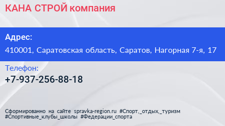 КАНА СТРОЙ, компания по адресу 410001, Саратовская область, Саратов, Нагорная 7-я, 17 в дальнейшем Организация, размещена в следующих категориях: