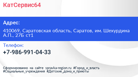 КатСервис64 по адресу 410069, Саратовская область, Саратов, им. Шехурдина А.П., 27Б ст1 в дальнейшем Организация, размещена в следующих категориях:
