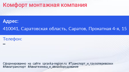 Комфорт, монтажная компания по адресу 410041, Саратовская область, Саратов, Прокатная 4-я, 15 в дальнейшем Организация, размещена в следующих категориях: